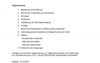 Der Vorstand der SpVg Laatzen lädt alle Mitglieder zur Jahreshauptversammlung am 14. Februar 2020 ein. Einzelheiten zum Ablauf sind in der Tagesordnung nachzulesen.